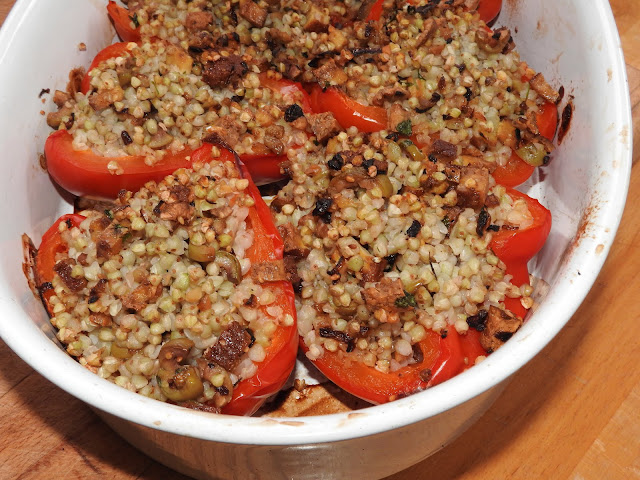 Learning from my mistake I cooked something that didn't include any meat or dairy substitutes. I cooked buckwheat stuffed peppers. They were good. The filling was a mixture of onion, tofu, green olives and buckwheat. I only had smoked tofu with sesame seeds but I think it added a nice flavour to the recipe, which used plain tofu. I am very fond of smoked foods. Everyone except Annie liked the stuffed peppers. Annie found the olives offensive. She turned each buckwheat grain over to confirm its identity. One last word about buckwheat: the recipe instructs you to  rinse the cooked buckwheat with cold water. Do absolutely not try to save time here, it really needs a good rinse. I rather like this grain, it makes a change from couscous or rice.
